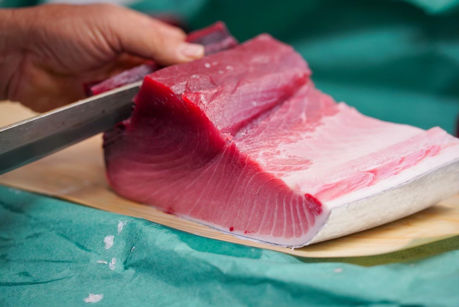 本マグロ(クロマグロ)と呼ばれるマグロ。黒く光る巨体で希少価値が高く、滑らかな舌触りと蕩ける脂が絶品であり「黒い海のダイヤ」とも呼ばれています。